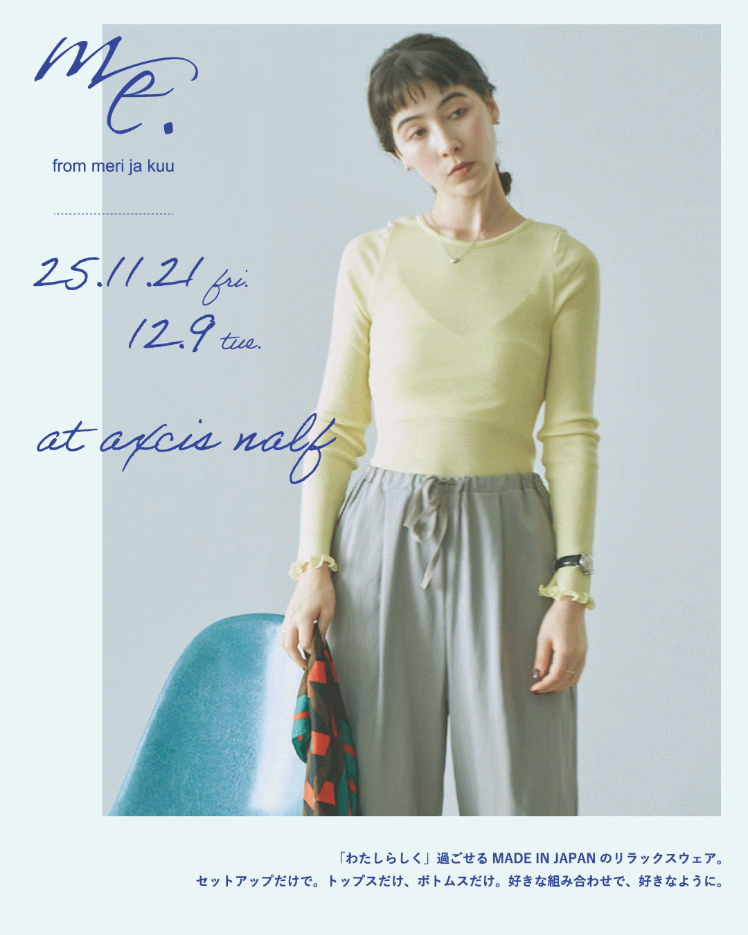 「繰り返し洗いやすく、乾きやすい。薄手のコットンで、日常にそっと寄り添ってくれるインナーを作りたい。」という思いから生まれたブランド「me.(ミードット)」。「わたしらしく」過ごせるMADE IN JAPANのリラックスウェアブランドは、meri ja kuuの2文字、そして「わたし」を意味する「me」から名付けられました。今回はこれからの季節にぴったりの、着心地のよいお洋服をお届けくださいます。