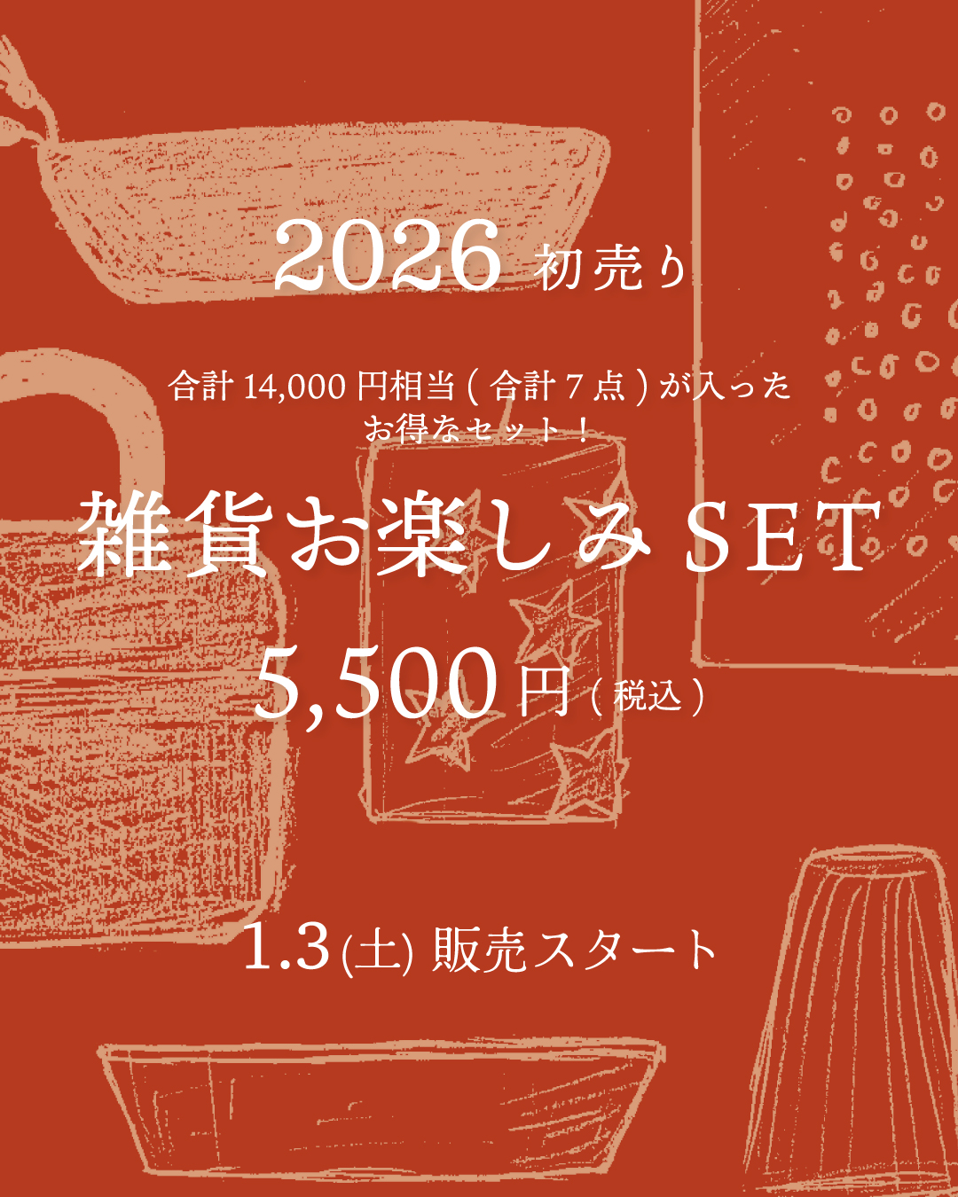 2026年の初売りは1月3日(土)10:00よりスタートいたします。14,000円相当が5,500円でお求めいただける、雑貨のお楽しみSETをご用意しております。